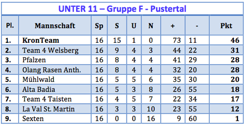 Der souveräne Spitzenreiter konnte sich auswärts auch gegen Pfalzen behaupten. Auch dieses letzte Spiel der Rückrunde wurde keineswegs auf die leichte Schulter genommen. Die Tore erzielten Schwemberger Lukas, Rigo Marian (2) und Niederkofler Samuel. Glückwunsch zum erreichten Titel (Kreissieger) in dieser Kategorie. Nun gilt es sich ganz auf das Halbfinale zu konzentrieren, welches am 31.05. in Jenesien über die Bühne gehen wird.