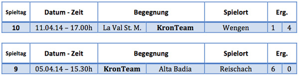 Der Gegner kam vom Tschöggelberg und hieß Jenesien. Unsere Mannschaft war auch dieses Mal sehr gut eingestellt und bis auf die Haarspitzen motiviert, d.h. man wollte diese tolle Saison unbedingt noch mit einer Medaille beenden. Das ist dann auch eindruckvoll gelungen mit einem 7-0 Kantersieg. Der Sieg ging auch in dieser Höhe vollends in Ordnung, da die gegnerische Mannschaft dem Kronteam in keiner Phase des Spieles das Wasser reichen konnte. Eine Gratulation dem gesamten Team, aber ein Spieler hat dieser Partie seinen Stempel besonders aufgedruckt und zwar Rigo Marian, welcher gleich alle 7!!! Tore erzielt hat. Wirklich ein tolles Team und weiter so, wir sehen uns hoffentlich im Herbst 2014 alle fit und gesund wieder.