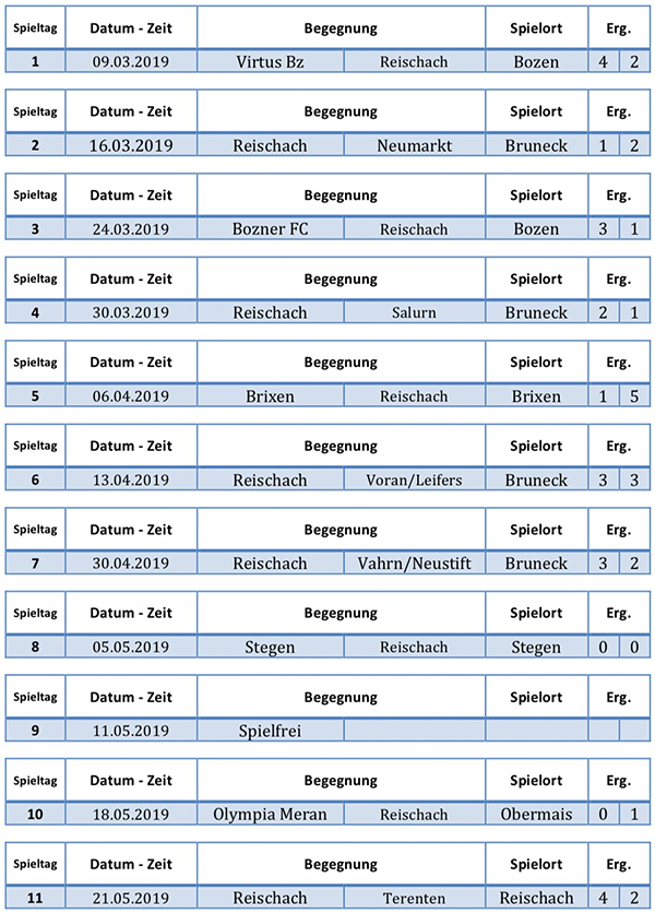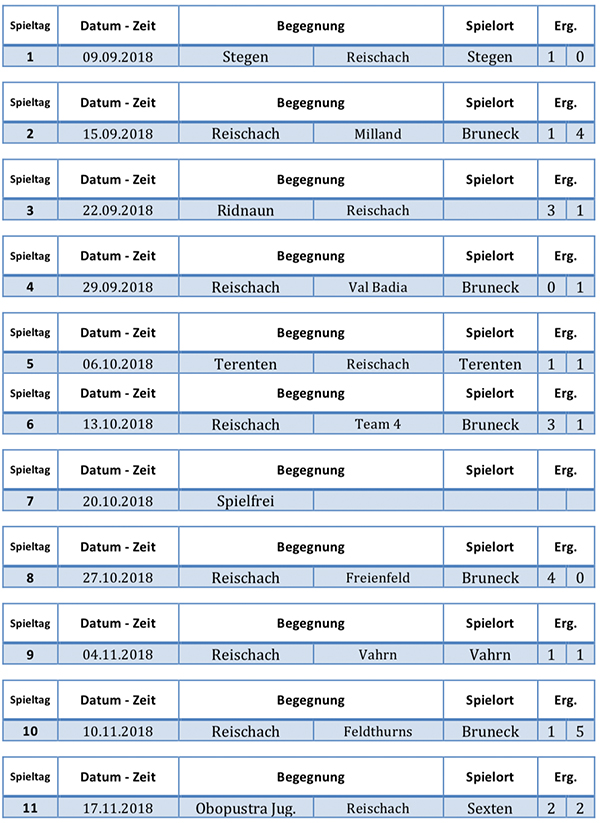 Am Samstag den 22.09.18 spielten wir in Sterzing gegen die Auswahl Ridnauntal. Es war das erwartet schwierige Spiel. Zu Beginn schlichen sich einige kleine Unkonzentriertheiten in unser Spiel ein. Daraus folgte das 1:0 der Auswahl Ridnauntal. Wenig später folgte ein Freistoß am Strafraum, der vom Gegenspieler unhaltbar in unserem Tor landete. Kurz vor der Halbzeitpause gelang der gegnerischen Mannschaft, durch eine Unachtsamkeit unserer Hintermannschaft das 3:0. In der zweiten Halbzeit kam unsere Mannschaft sehr entschlossen aus der Kabine und so spielten sie dann auch. Ein Angriff folgte dem nächsten. Der Gegner konnte nur mehr reagieren. Trotzdem gelang uns vorerst kein Tor. Mit etwas Glück, ein Spieler kratzte den Ball von der Linie, ein weiterer Schuss verfehlte das Tor gänzlich knapp, blieb es beim 3:0. Bis kurz vor Schluss Sondi das 1:3 erzielte. Die Zeit war leider zu knapp, um eine Aufholjagd zu starten. So endete das Spiel 3:1 Aufgrund der gut gespielten zweiten Halbzeit, gehen wir zuversichtlich ins nächste Heimspiel.